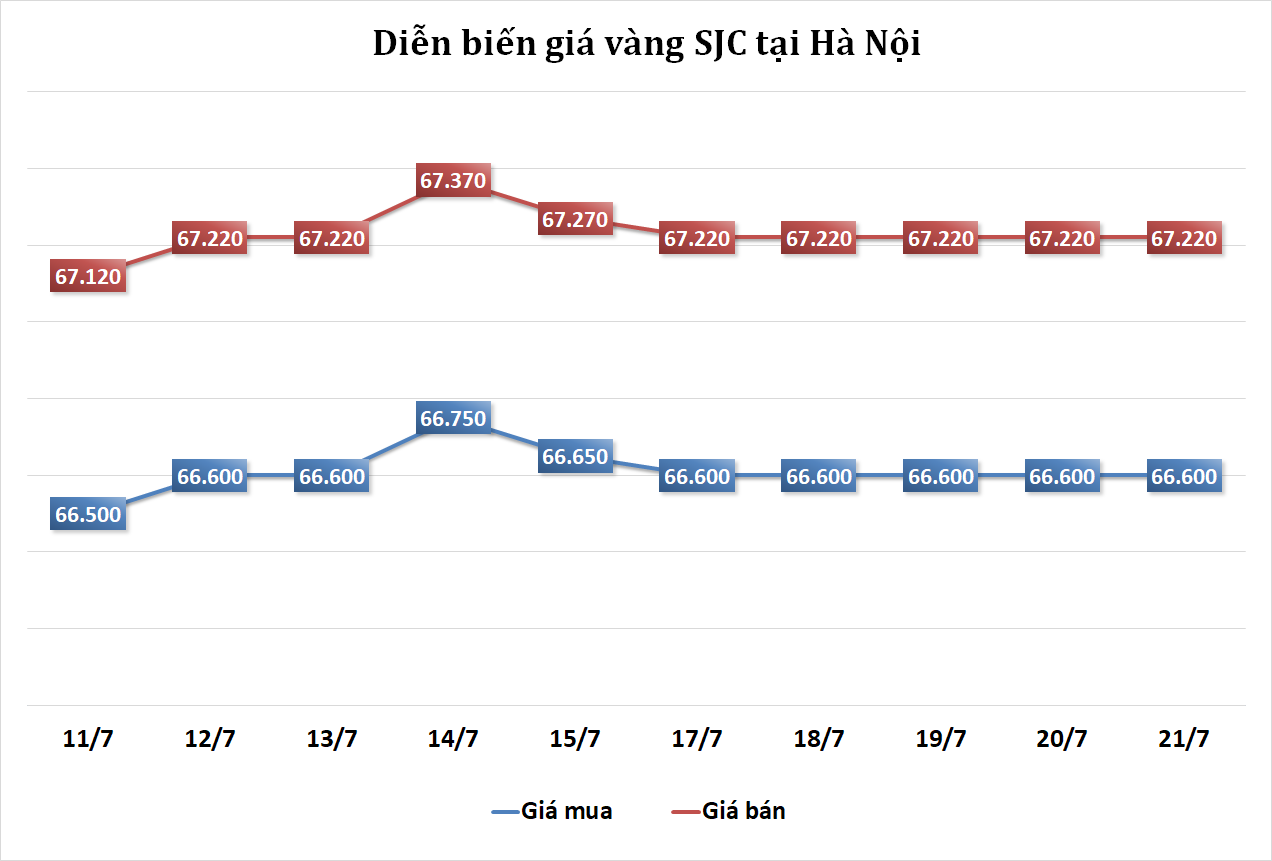 Tại Hà Nội, giá vàng SJC được niêm yết ở mức 66,60 - 67,22 triệu đồng/lượng, không đổi so với cuối phiên trước.