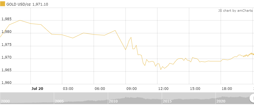 Tính đến 8h sáng nay (21/7) theo giờ Việt Nam, giá vàng giao ngay tăng 1,8 USD (+0,09%) so với mở cửa lên mức 1.970,8 USD/oz, giao dịch đang dao động trong khoảng 1.964,6 - 1.985,1 USD/oz.