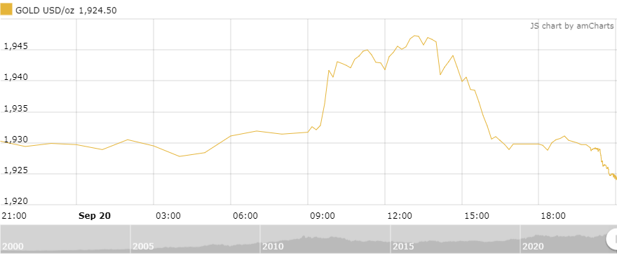 Giá vàng giảm nhanh trở lại sau khi tăng vọt lên 1.968,9 USD/oz ngay khi cuộc họp chính sách tiền tệ tháng 9 của Ủy ban Thị trường Mở Liên bang (FOMC) kết thúc và sau công bố về chính sách của Cục Dự trữ Liên bang Mỹ (Fed), bao gồm tóm tắt dự báo kinh tế và biểu đồ dấu chấm mới nhất.