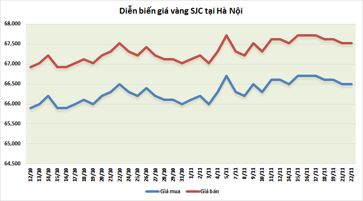 Tại Hà Nội, giá vàng SJC được niêm yết ở mức 66,50 - 67,52 triệu đồng/lượng, không đổi so với cuối phiên trước, nhưng đã giảm 100 nghìn đồng/lượng ở cả hai chiều mua - bán so với cùng thời điểm hôm qua.