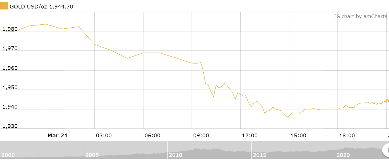 Tính đến 8h sáng nay (22/3) theo giờ Việt Nam, giá vàng giao ngay tăng 5 USD (+0,26%) so với mở cửa lên 1.945 USD/oz, giao dịch đang dao động trong khoảng 1.935,1 - 1.984,5 USD/oz.