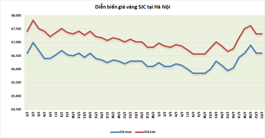Tại Hà Nội, giá vàng SJC được niêm yết ở mức 66,60 - 67,30 triệu đồng/lượng, không đổi so với cuối phiên trước đó nhưng đã giảm 100 nghìn đồng/lượng ở cả chiều mua vào và bán ra so với sáng hôm qua.