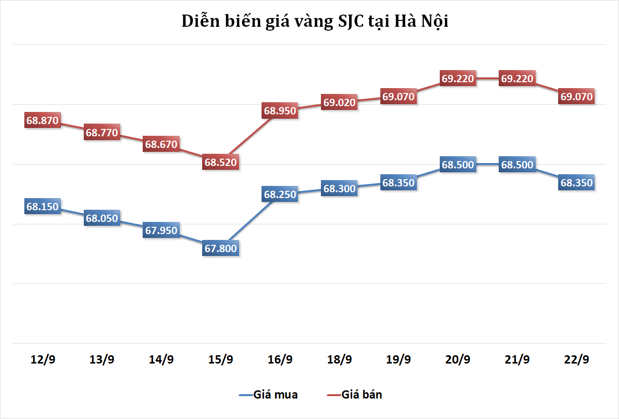 Tại Hà Nội, giá vàng SJC được niêm yết ở mức 68,35 - 69,07 triệu đồng/lượng, không đổi so với cuối phiên trước nhưng đã giảm 150 nghìn đồng/lượng ở cả 2 chiều mua vào và bán ra so với cùng thời điểm ngày hôm qua.