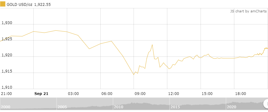 Tính đến 8h sáng nay (22/9) theo giờ Việt Nam, giá vàng giao ngay tăng 3,1 USD (+0,16%) so với mở cửa, hiện ở mức 1.922,6 USD/oz, giao dịch đang dao động trong khoảng 1.912,2-1.930,9 USD/oz.