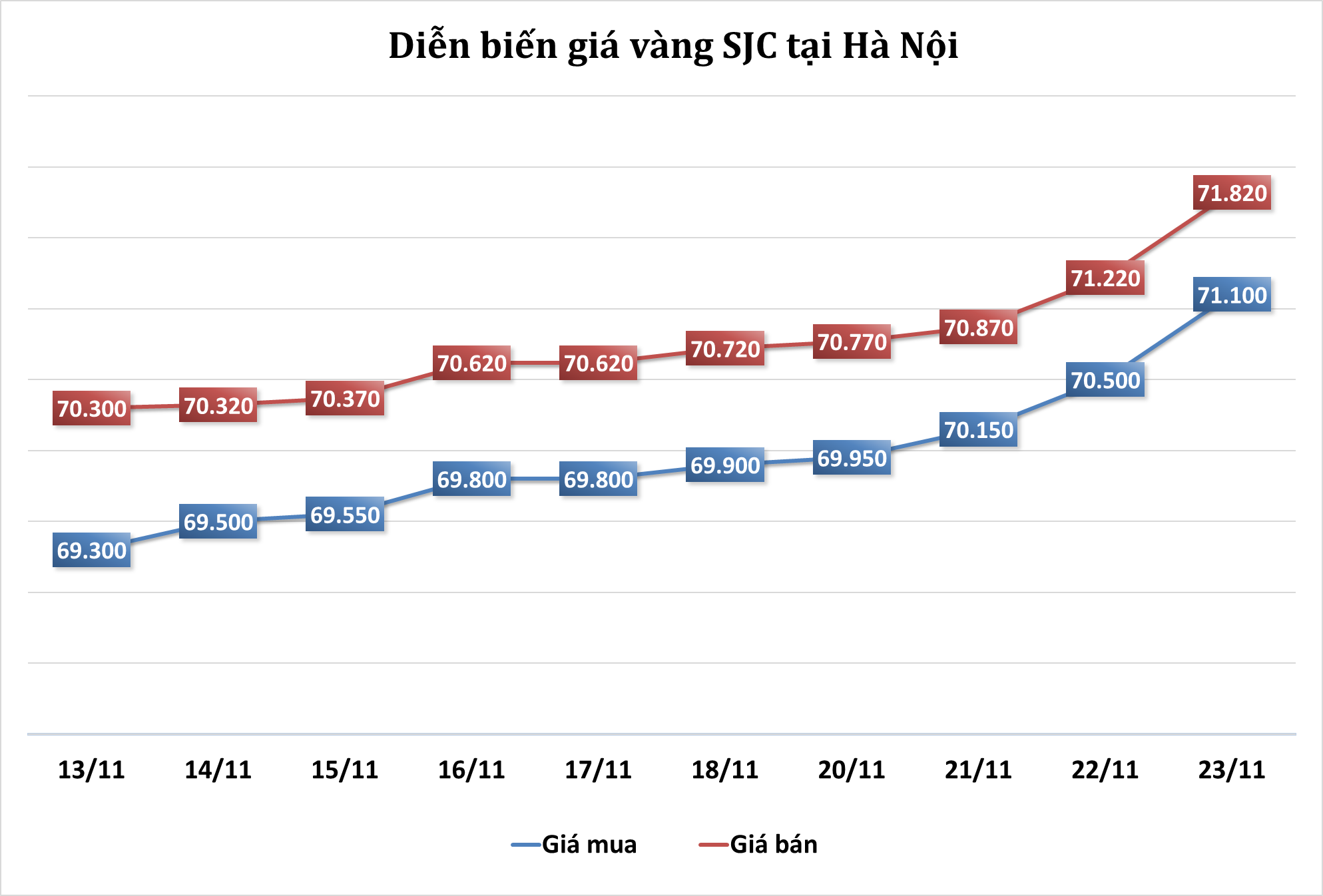 Tại Hà Nội, giá vàng SJC được niêm yết ở mức 71,10 - 71,82 triệu đồng/lượng, không đổi so với cuối phiên trước, nhưng đã tăng 600 nghìn đồng/lượng ở cả giá mua và giá bán so với cùng thời điểm ngày hôm qua.