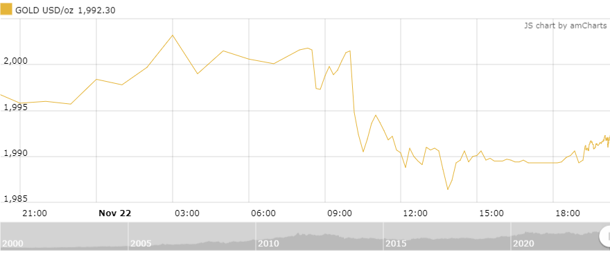 Tính đến 8h sáng nay (23/11) theo giờ Việt Nam, giá vàng giao ngay tăng 3 USD/oz (+0,15%) so với mở cửa, hiện ở mức 1.992,3 USD/oz, giao dịch đang dao động trong khoảng 1.986,2-2.006,7 USD/oz.