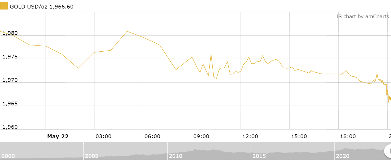 Tính đến 8h sáng nay (23/5) theo giờ Việt Nam, giá vàng giao ngay giảm 5,2 USD (-0,26%) so với mở cửa xuống 1966,6 USD/oz, giao dịch đang dao động trong khoảng 1.96554-1.983,7 USD/oz.