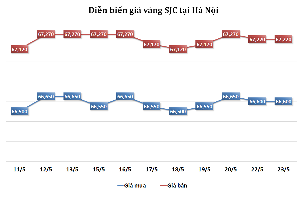 Tại Hà Nội, giá vàng SJC được niêm yết ở mức 66,60 - 67,22 triệu đồng/lượng, không đổi so với cuối phiên trước nhưng đã giảm 100 nghìn đồng ở chiều mua và giảm 200 nghìn đồng/lượng ở chiều bán so với cùng thời điểm phiên trước.