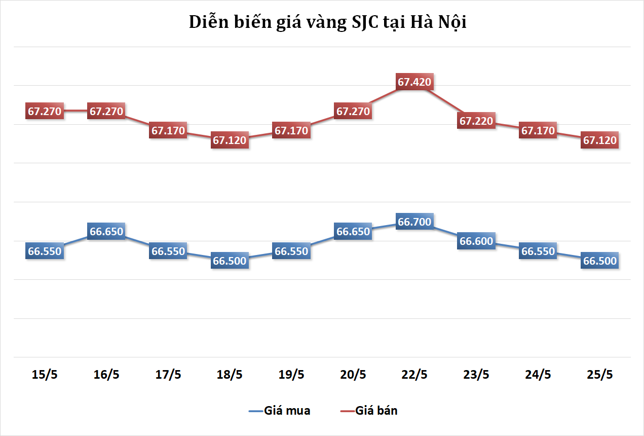 Tại Hà Nội, giá vàng SJC được niêm yết ở mức 66,50 - 67,12 triệu đồng/lượng, không đổi so với cuối phiên trước nhưng đã giảm 50 nghìn đồng ở cả 2 chiều mua và bán so với cùng thời điểm phiên trước.