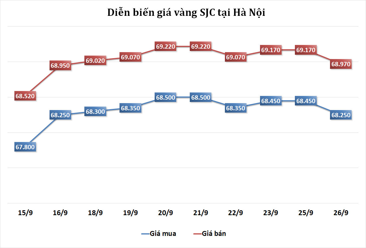 Tại Hà Nội, giá vàng SJC được niêm yết ở mức 68,25 - 68,97 triệu đồng/lượng, không đổi so với cuối phiên trước nhưng đã giảm 200 nghìn đồng/lượng ở cả 2 chiều mua và bán so với cùng thời điểm ngày hôm qua.