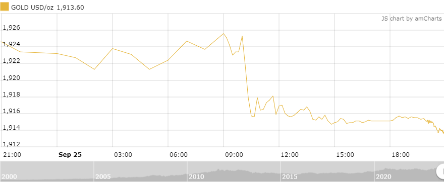 Tính đến 8h sáng nay (26/9) theo giờ Việt Nam, giá vàng giao ngay giảm 1,5 USD (-0,08%) so với mở cửa, hiện ở mức 1.913,6 USD/oz, giao dịch đang dao động trong khoảng 1.913,6-1.927,9 USD/oz.