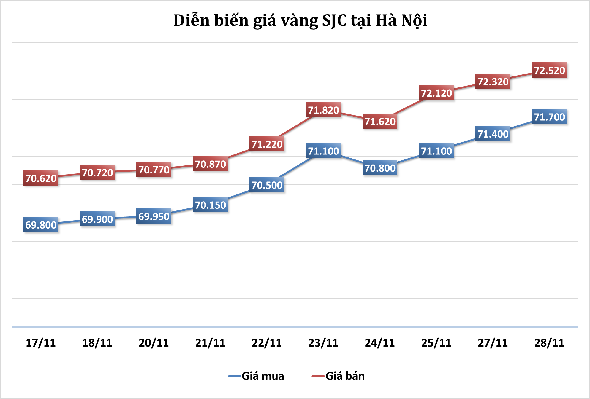 Tại Hà Nội, giá vàng SJC được niêm yết ở mức 71,70 - 72,52 triệu đồng/lượng, không đổi so với cuối phiên trước, nhưng đã tăng 300 nghìn đồng/lượng ở giá mua và 200 nghìn đồng/lượng ở giá bán so với cùng thời điểm ngày hôm qua.