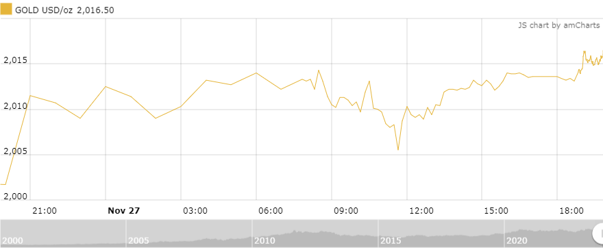 Tính đến 8h sáng nay (28/11) theo giờ Việt Nam, giá vàng giao ngay tăng 2,9 USD/oz (+0,14%) so với mở cửa, hiện ở mức 2.016,5 USD/oz, giao dịch đang dao động trong khoảng 2.004,9-2.017,6 USD/oz.