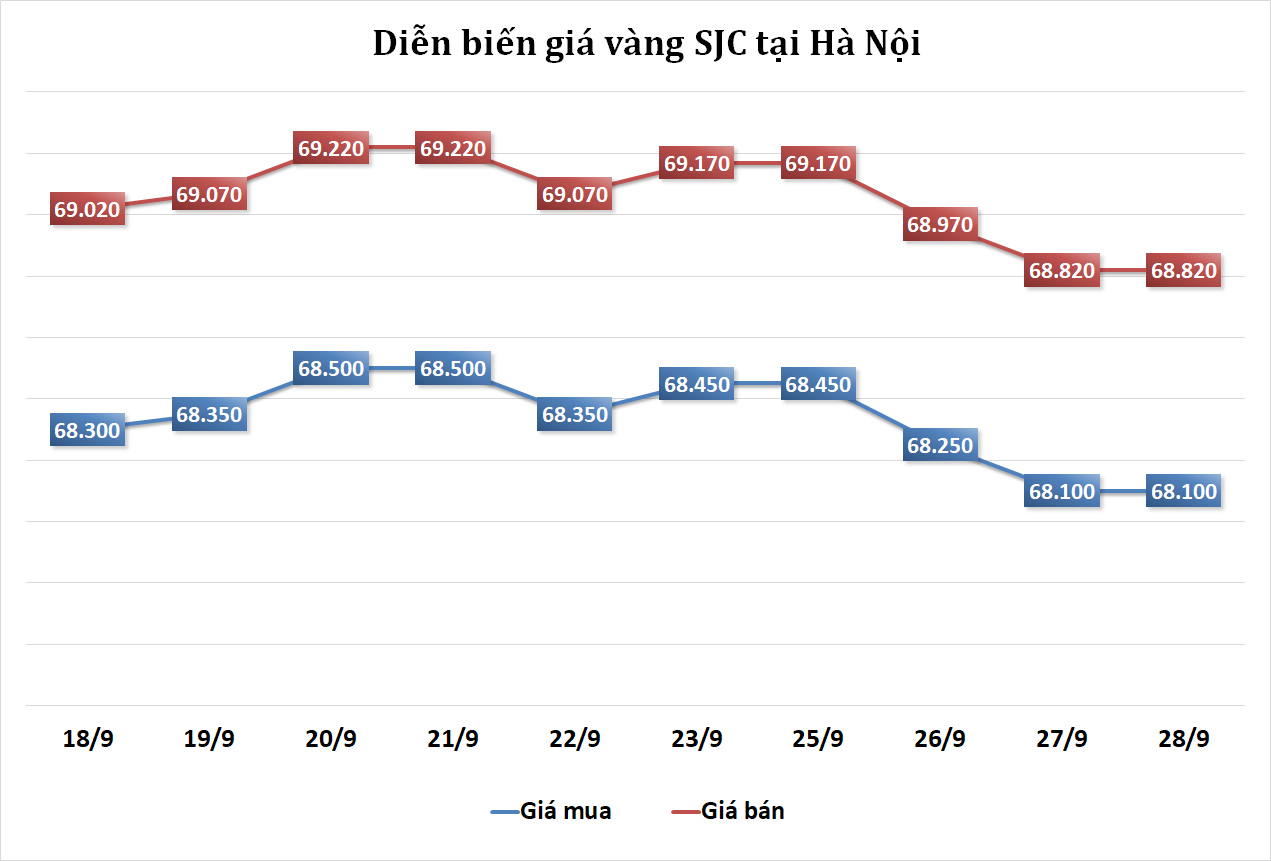 Tại Hà Nội, giá vàng SJC được niêm yết ở mức 68,10 - 68,82 triệu đồng/lượng, không đổi so với cuối phiên trước.