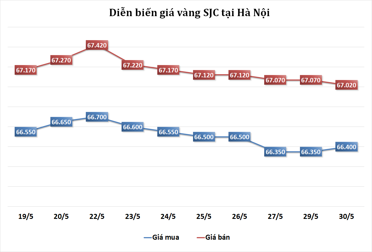 Tại Hà Nội, giá vàng SJC được niêm yết ở mức 66,40 - 67,02 triệu đồng/lượng, không đổi so với cuối phiên trước nhưng đã tăng 50 nghìn đồng/lượng ở chiều mua trong khi giảm 50 nghìn đồng/lượng ở chiều bán so với cùng thời điểm ngày hôm qua.