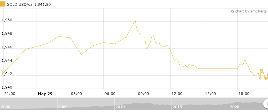 Tính đến 8h sáng nay (30/5) theo giờ Việt Nam, giá vàng giao ngay giảm 4,3 USD (-0,22%) so với mở cửa xuống 1.941,9 USD/oz, giao dịch đang dao động trong khoảng 1.940,9-1.951,7 USD/oz.