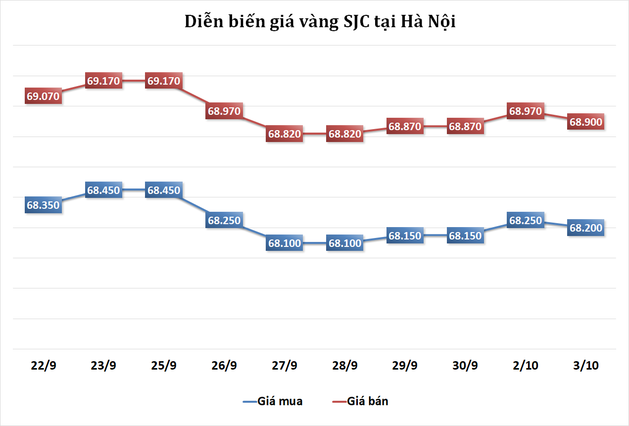 Tại Hà Nội, giá vàng SJC được niêm yết ở mức 68,20 - 68,92 triệu đồng/lượng, không đổi so với cuối phiên trước nhưng đã giảm 50 nghìn đồng/lượng ở cả 2 chiều mua và bán so với cùng thời điểm ngày hôm qua.