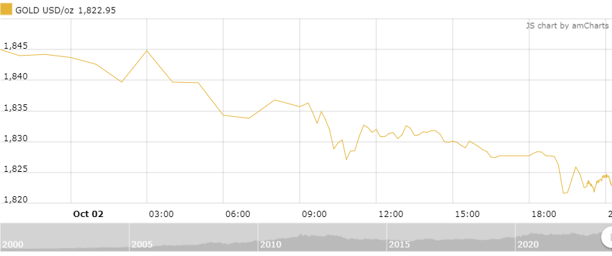 Tính đến 8h sáng nay (3/10) theo giờ Việt Nam, giá vàng giao ngay giảm 4,7 USD (-0,26%) so với mở cửa, hiện ở mức 1.823 USD/oz, giao dịch đang dao động trong khoảng 1.820-1.847,5 USD/oz.