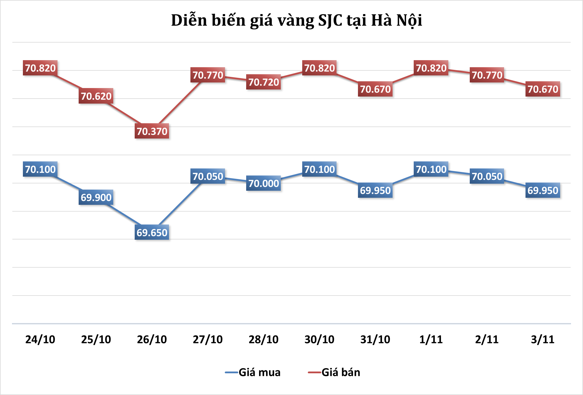 Tại Hà Nội, giá vàng SJC được niêm yết ở mức 69,95 - 70,67 triệu đồng/lượng, không đổi so với cuối phiên trước nhưng đã giảm 100 nghìn đồng/lượng ở cả 2 chiều mua và bán so với cùng thời điểm ngày hôm qua.