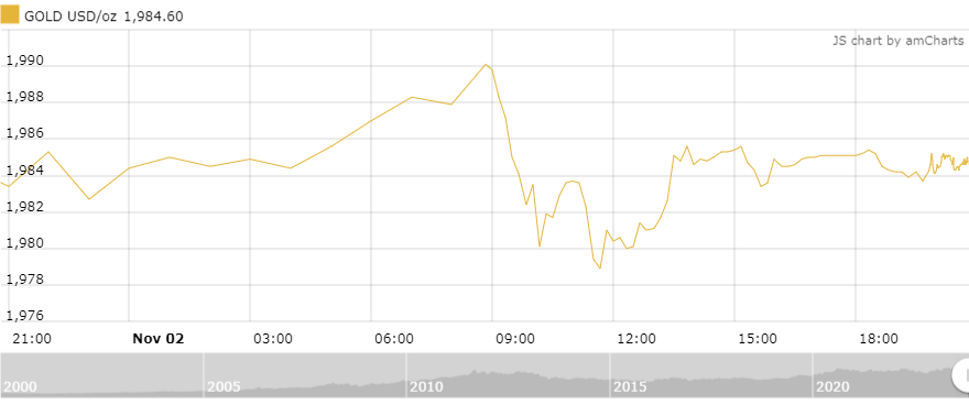 Tính đến 8h sáng nay (3/11) theo giờ Việt Nam, giá vàng giao ngay giảm 0,5 USD/oz (-0,03%) so với mở cửa, hiện ở mức 1.984,6 USD/oz, giao dịch đang dao động trong khoảng 1.977,9-1.991,7 USD/oz.