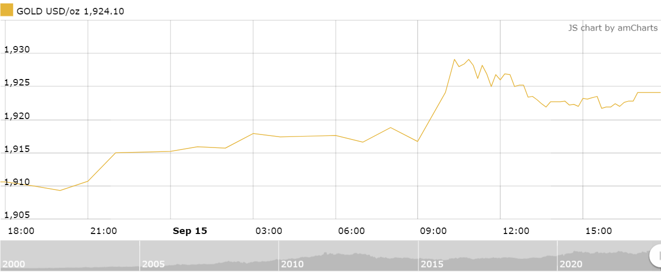 Tính đến 8h sáng nay (16/9) theo giờ Việt Nam, giá vàng giao ngay tăng 13,5 USD (+0,71%) so với mở cửa, hiện ở mức 1.924,1 USD/oz, giao dịch đang dao động trong khoảng 1.914,5-1.9312 USD/oz.