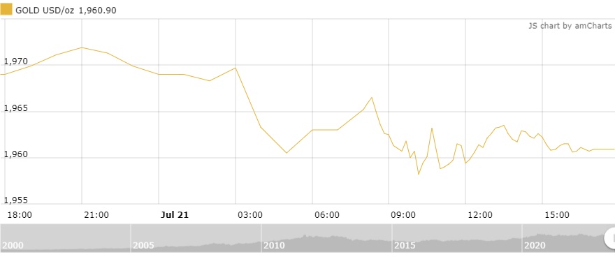 Tính đến 10h sáng nay (22/7) theo giờ Việt Nam, giá vàng giao ngay giảm 8,10 USD (-0,41%) so với mở cửa xuống mức 1,960.90 USD/oz, giao dịch đang dao động trong khoảng 1,972.20 - 1,955.90 USD/oz.