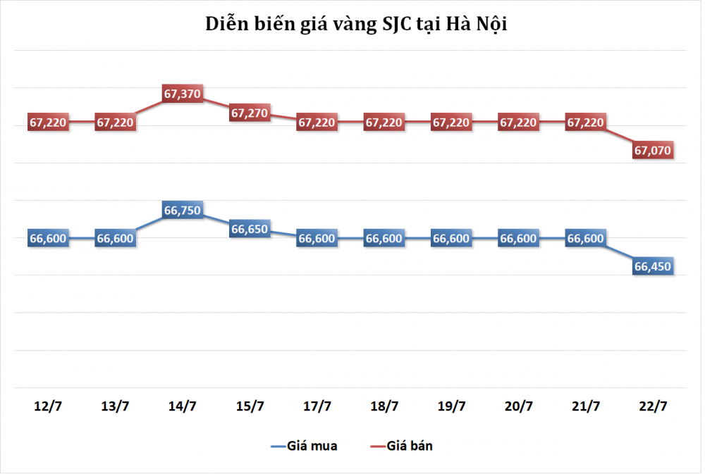 Tại Hà Nội, giá vàng SJC được niêm yết ở mức 66,450 - 67,070 triệu đồng/lượng, không đổi so với cuối phiên trước nhưng đã giảm 150 nghìn đồng/lượng ở cả 2 chiều mua và bán so với cùng thời điểm ngày hôm qua.