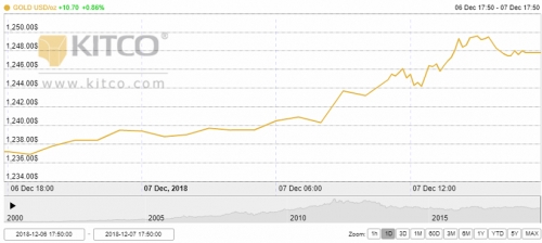 Theo khảo sát của thoibaonganhang.vn, đến 11h sáng nay (8/12) theo giờ Việt Nam, giá vàng thế giới giao ngay đứng ở mức 1.247,8 USD/oz, tăng 10,7 USD/oz so với cuối phiên trước. Giao dịch trong phiên dao động quanh ngưỡng 1.237,4 - 1.250,8 USD/oz.