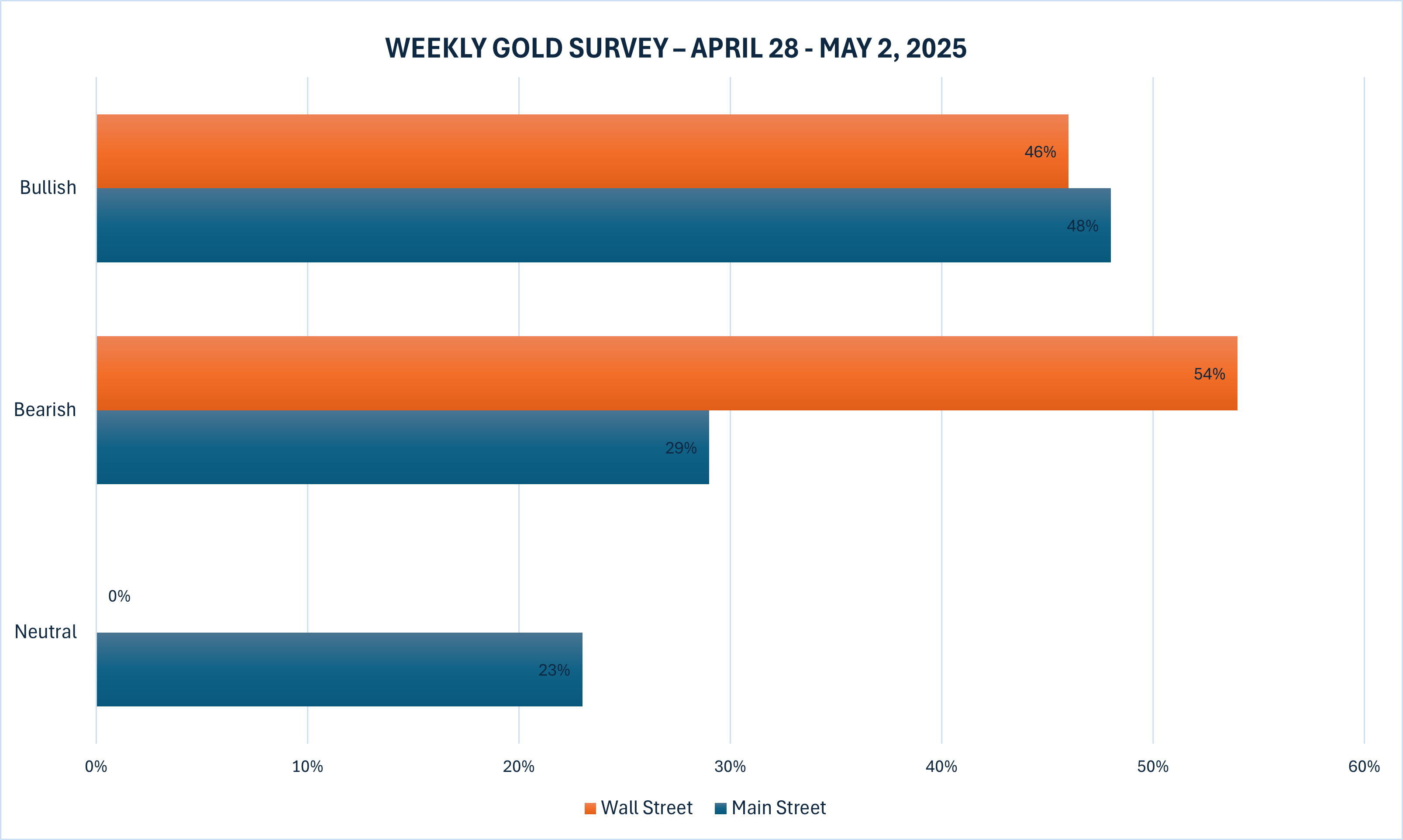 Khảo sát vàng hàng tuần của Kitco News cho thấy tâm lý thị trường phân hóa. Trong số 13 nhà đầu tư tham gia khảo sát, có 6 chuyên gia (tương đương 46%) cho rằng giá vàng sẽ tăng trong tuần tới. Trong khi 7 chuyên gia (tương đương 54%), dự đoán giá vàng sẽ giảm. Không có chuyên gia nào dự doán giá vàng sẽ đi ngang vào tuần tới.