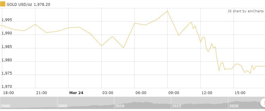 Tính đến 10h sáng nay (25/3) theo giờ Việt Nam, giá vàng giao ngay giảm 15,3 USD (-0,77%) so với mở cửa xuống 1.978,2 USD/oz, giao dịch đang dao động trong khoảng 1.975 - 2.004,3 USD/oz.