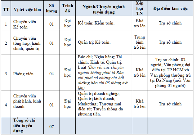 - Đối với vị trí Phóng viên, Kế toán: Độ tuổi không quá 35 tuổi.