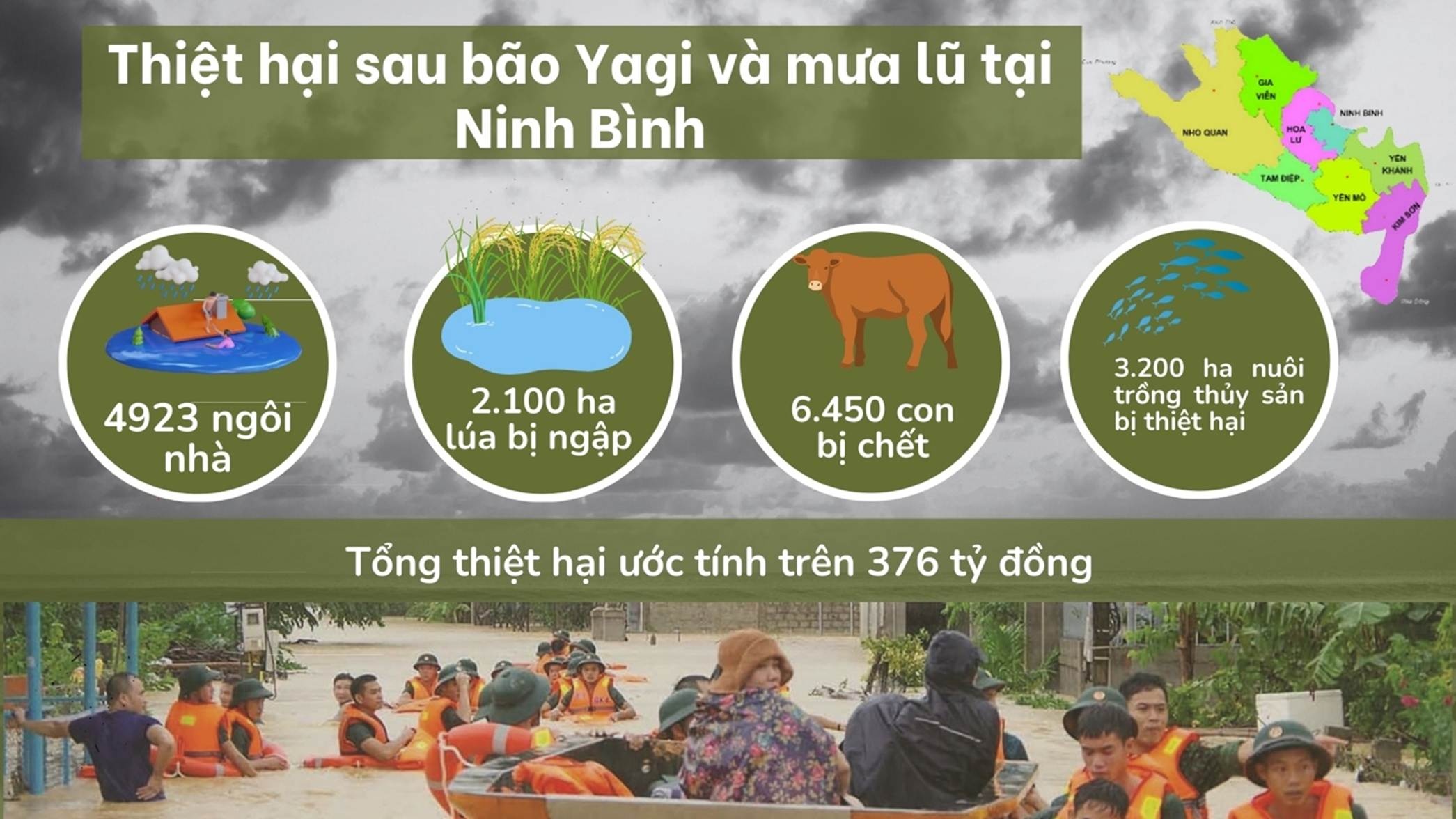 Ngay sau khi có thông tin về cơn bão số 3 (cơn bão Yagi), lãnh đạo tỉnh Ninh Bình đã xác định đây là cơn bão lớn, cường độ mạnh, tăng cấp nhanh, nguy cơ gây ra thiệt hại rất lớn nên tỉnh đã chủ động các phương án phòng, chống bão, lũ... để giảm thiệt hại do thiên tai xuống mức thấp nhất. May mắn thay, toàn tỉnh không có thiệt hại về người nhưng có đến 4.923 ngôi nhà bị ngập nước; 2.115,8ha lúa và 304,8ha hoa màu bị ảnh hưởng; trên 6.450 con gia súc, gia cầm bị chết, cuốn trôi; gần 3.200ha nuôi trồng thủy sản bị thiệt hại… Tổng thiệt hại ước tính trên 376 tỷ đồng.