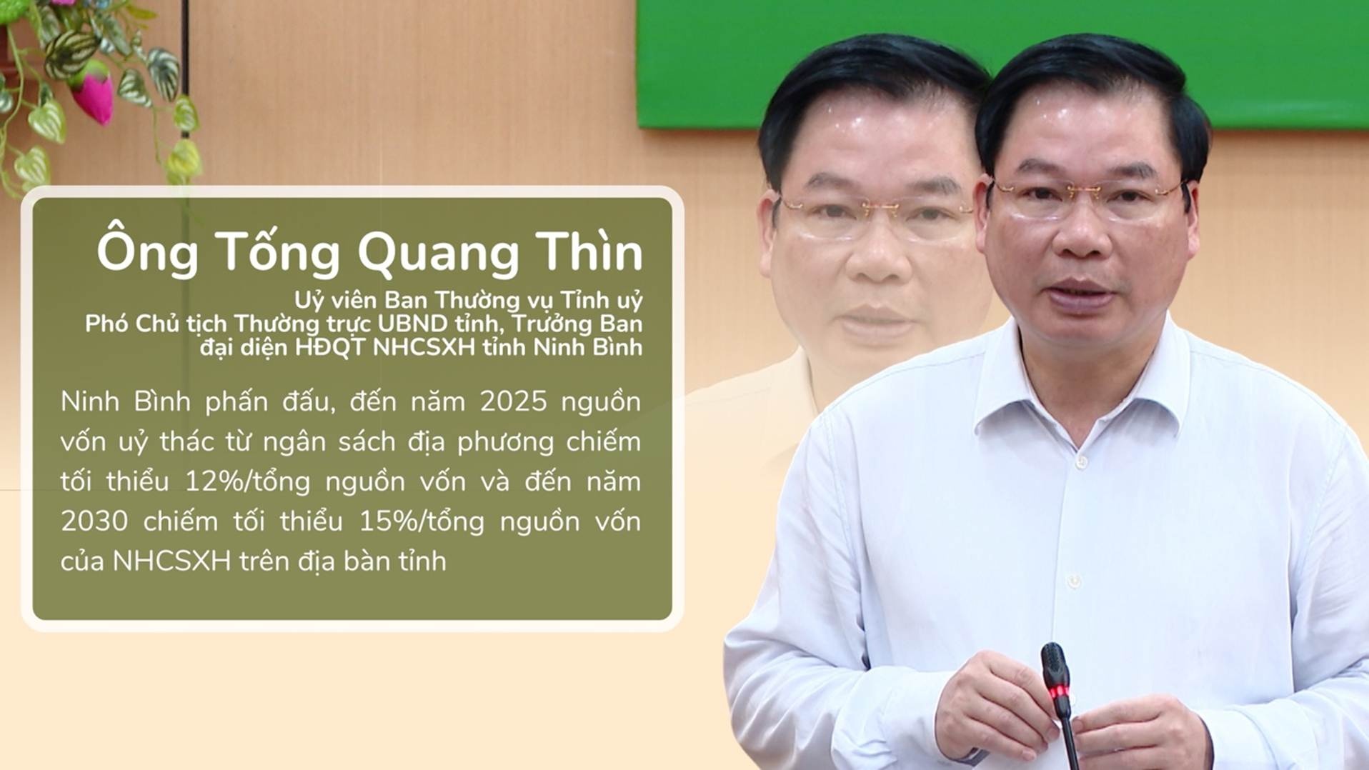 Đặc biệt, Ninh Bình phấn đấu, đến năm 2025 nguồn vốn uỷ thác từ ngân sách địa phương chiếm tối thiểu 12%/tổng nguồn vốn và đến năm 2030 chiếm tối thiểu 15%/tổng nguồn vốn của NHCSXH trên địa bàn tỉnh theo mục tiêu Chiến lược phát triển NHCSXH đến năm 2030 tại Quyết định số 05/QĐ-TTg ngày 04/01/2023 của Thủ tướng Chính phủ. Do vậy, ông Tống Quang Thìn mong muốn và đề nghị các cấp tiếp tục quan tâm, tạo điều kiện hơn nữa để công tác tín dụng chính sách xã hội trên địa bàn tỉnh ngày càng phát triển và thu được nhiều kết quả hơn nữa trong thời gian tới và để phát huy hơn nữa hiệu quả của tín dụng chính sách xã hội, phù hợp với bối cảnh, tình hình phát triển kinh tế - xã hội trong giai đoạn mới.
