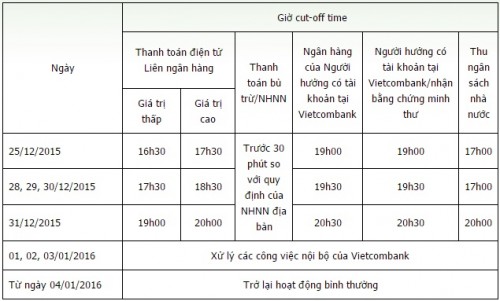 Ngân hàng TMCP Ngoại thương Việt Nam (Vietcombank) xin trân trọng gửi tới khách hàng chi tiết thời gian hoạt động thanh toán trong dịp cuối năm 2015 như sau: