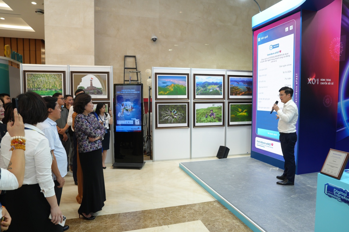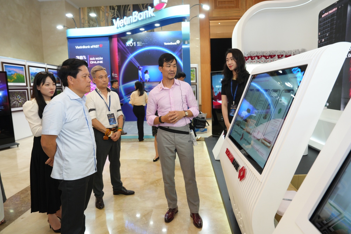 | Phó tổng giám đốc VietinBank Trần Công Quỳnh Lân thuyết trình về công nghệ nổi bật của ngân hàng tại gian hàng triển lãm |