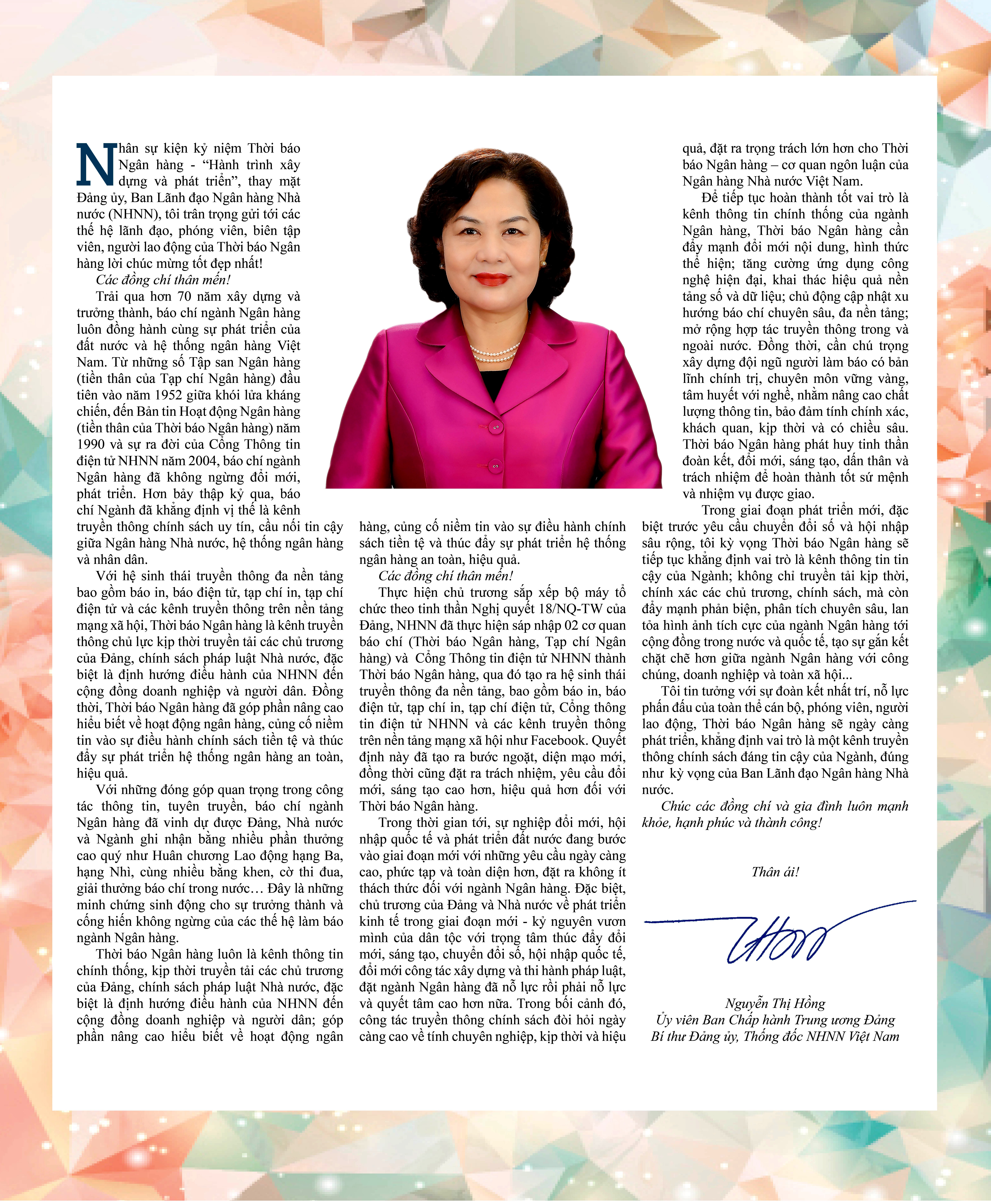 Thư chúc mừng Thời báo Ngân hàng của Thống đốc Ngân hàng Nhà nước Việt Nam