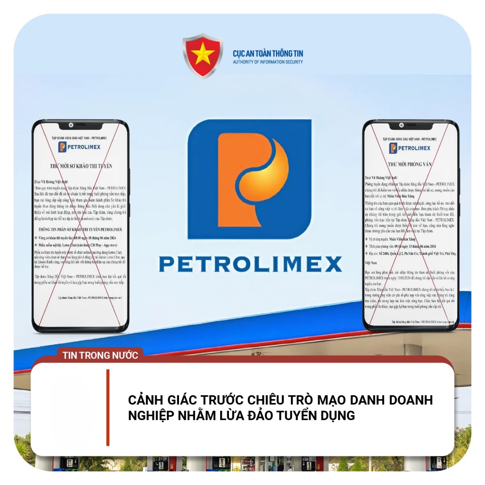 Cục ATTT trong thời qua đã ghi nhận thực trạng lừa đảo mạo danh Tập đoàn Xăng dầu Việt Nam (Petrolimex/Tập đoàn) và các đơn vị thành viên của Petrolimex đang ngày càng gia tăng về cả số lượng lẫn hình thức tinh vi. Các đối tượng sử dụng hàng loạt chiêu trò với mục đích chiếm đoạt tài sản người dùng như: Tuyển dụng online, tạo đơn hàng online, mở thẻ vay tiền, giả mạo nhân viên báo xăng…