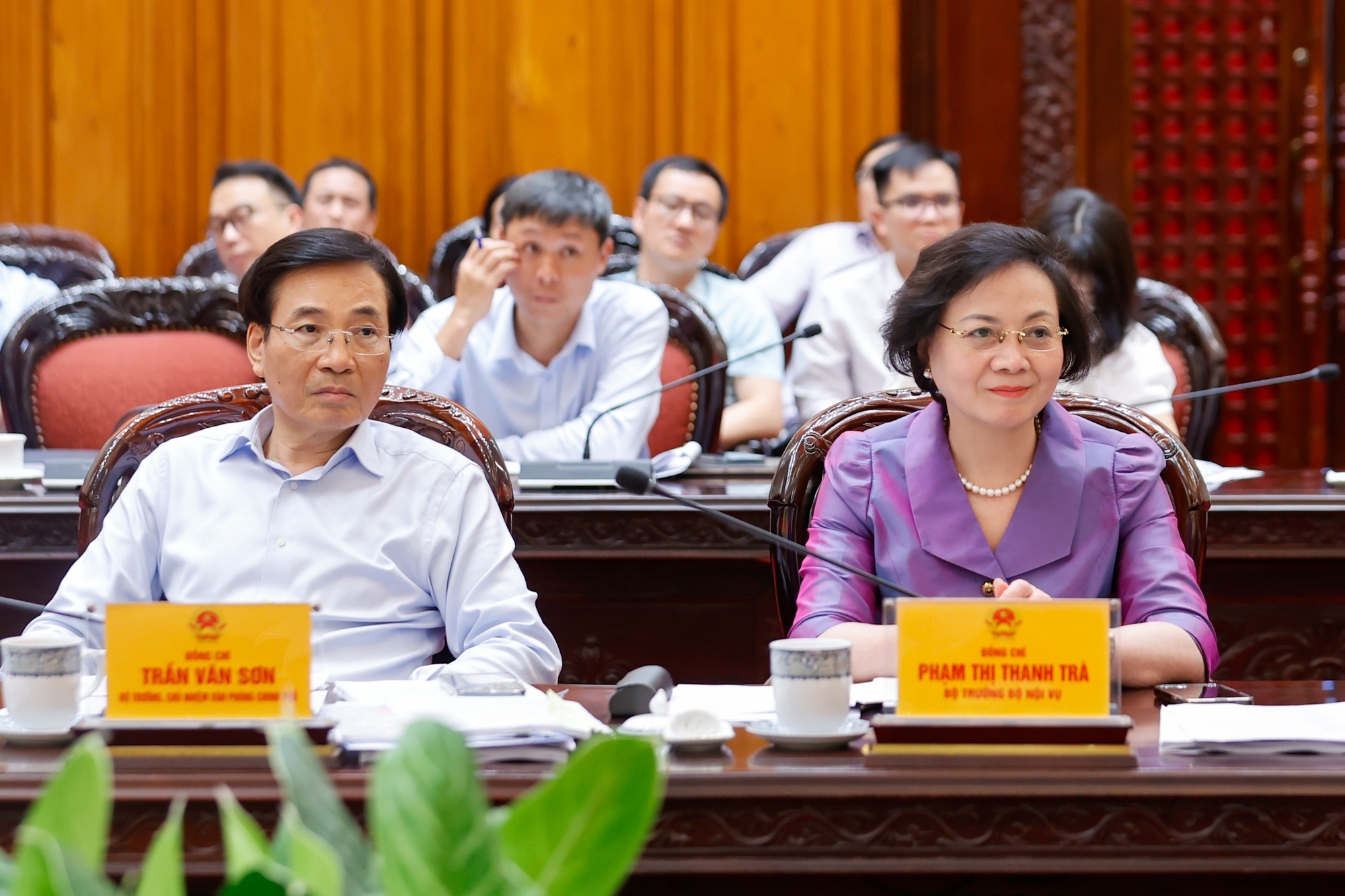 | Bộ trưởng, Chủ nhiệm Văn phòng Chính phủ Trần Văn Sơn và Bộ trưởng Bộ Nội vụ Phạm Thị Thanh Trà dự và phát biểu tại phiên họp - Ảnh: VGP/Nhật Bắc |