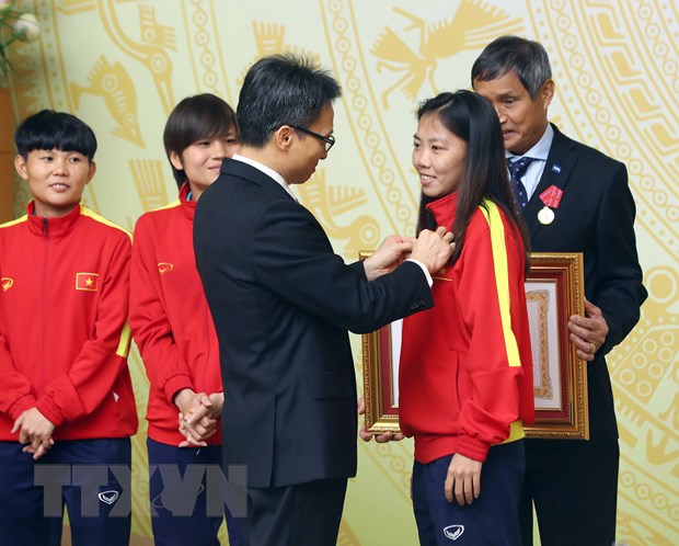 | Phó Thủ tướng Vũ Đức Đam gắn Huân chương Lao động hạng Nhì, hạng Ba cho các cầu thủ Đội tuyển Bóng đá nữ Việt Nam có thành tích xuất sắc. (Ảnh: Phạm Kiên/TTXVN) |