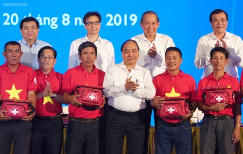 Thủ tướng trao tặng cờ Tổ quốc, dụng cụ sơ cấp cứu cho 20 ngư dân tiêu biểu của Bình Định. Ảnh: VGP/Quang Hiếu