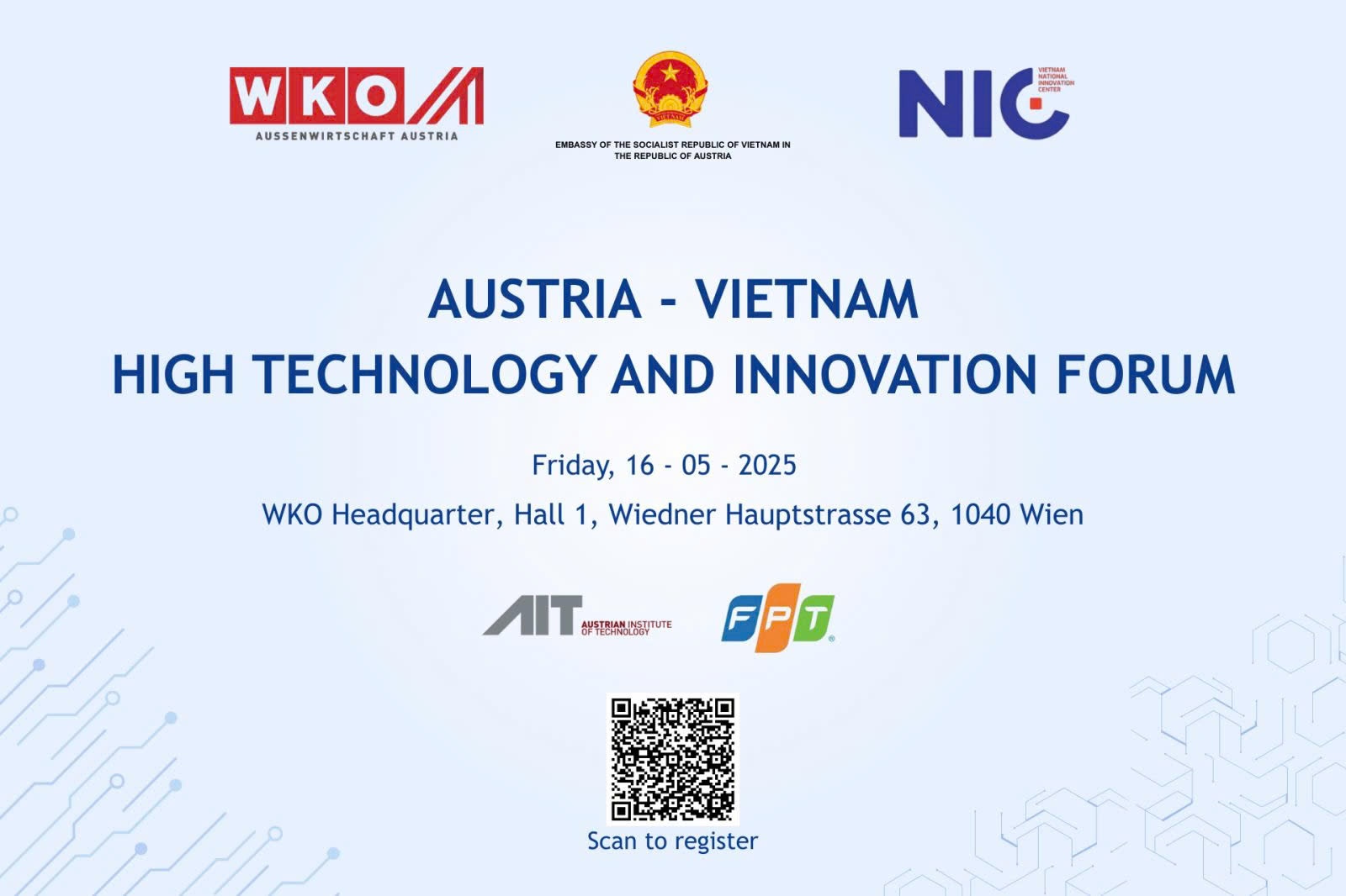 Diễn đàn do Đại sứ quán Việt Nam tại Áo, Trung tâm Đổi mới sáng tạo Quốc gia (NIC – thuộc Bộ Tài chính) phối hợp với Phòng Thương mại Liên bang Áo (WKO) đồng tổ chức. Phó Thủ tướng Chính phủ Nguyễn Chí Dũng sẽ tham dự và phát biểu chỉ đạo trực tuyến tại sự kiện.