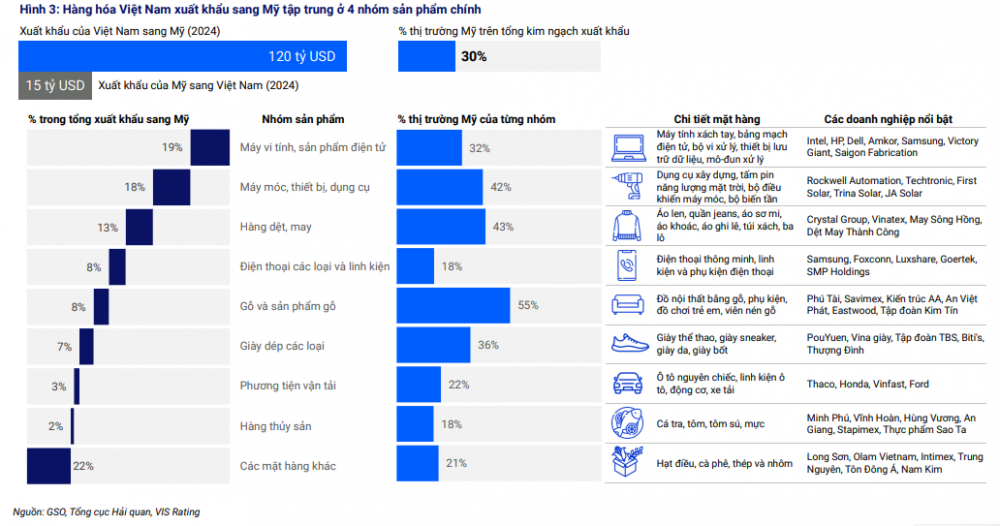 Nếu Việt Nam bị áp thêm thuế, VIS Rating cho rằng những ngành công nghiệp chính sẽ bị ảnh hưởng và dễ bị tổn thương nhất là đồ điện tử, thiết bị máy móc, dệt may, giày dép và đồ gỗ. Các ngành này chiếm phần lớn kim ngạch xuất khẩu sang Mỹ, và nhiều doanh nghiệp có tỷ lệ doanh thu xuất khẩu phụ thuộc cao vào thị trường này.
