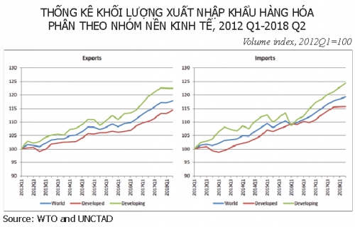 Theo báo cáo của WTO về triển vọng thương mại toàn cầu 2018 và dự báo 2019 vừa đưa ra đầu tháng 9/2018 cho biết trong nửa đầu năm 2018, thương mại hàng hóa toàn cầu ước đạt mức tăng 3,8% so với cùng kỳ năm trước, trong đó tăng trưởng xuất khẩu của các nền kinh tế phát triển là 3,5% và tại các nền kinh tế đang phát triển là 3,6%.