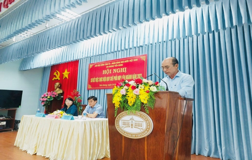Đồng chủ trì Hội nghị có đồng chí Nguyễn Văn Mười, Ủy viên Ban Thường vụ, Trưởng Ban Nội chính Tỉnh ủy Tiền Giang và đồng chí Nguyễn Thị Đậm, Bí thư Đảng ủy, Giám đốc Ngân hàng Nhà nước chi nhánh tỉnh Tiền Giang.
