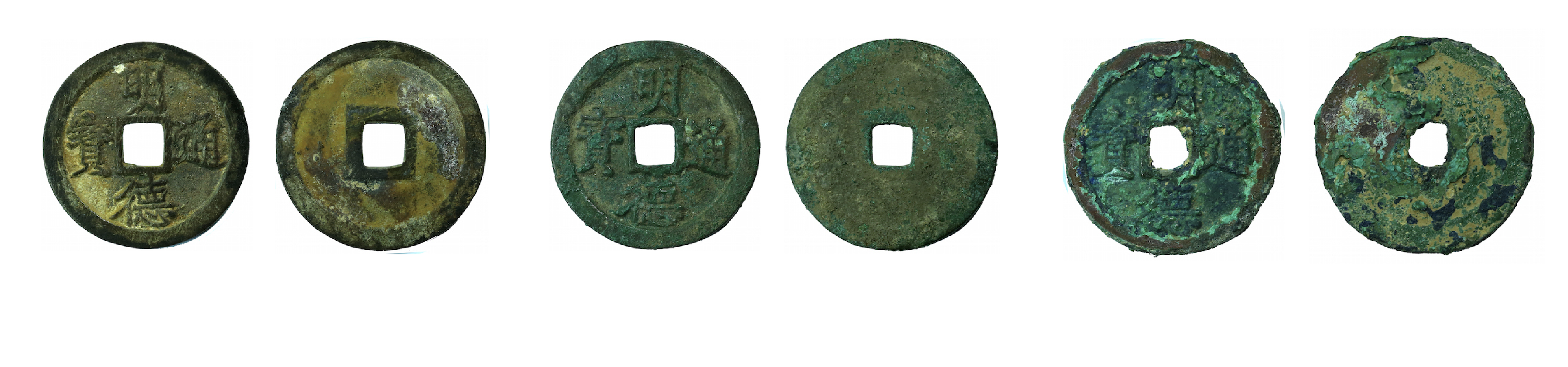 | Ảnh 1.7.1. Tiền Minh Đức thông bảo 明德通寳, kiểu chữ Hoa áp, lưng tiền trơn, đường kính 23,5- 24,0 mm |