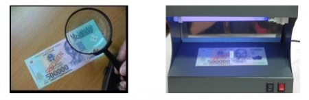 Ở tiền giả: mảng chữ siêu nhỏ chỉ là các chấm màu hoặc các dòng chữ, số không sắc nét, khó đọc. Không có mực không màu phát quang hoặc có làm giả nhưng phát quang yếu. Số sêri không phát quang hoặc phát quang không giống như tiền thật.