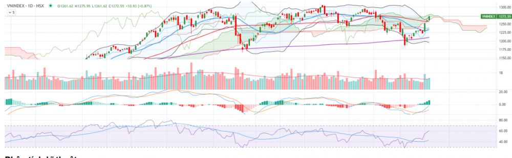 Một số phân tích khác thì cho biết, VN-Index tăng vượt lên trên vùng 1.270 điểm với lực mua chủ động tiếp tục được cải thiện. Hai chỉ báo MACD và RSI đều hướng lên, cho thấy thị trường tiếp tục dao động tìm kiếm động lực trở lại vùng 1.280-1.290 điểm.