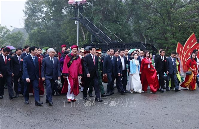 Tại Điện Kính Thiên, trên đỉnh núi Nghĩa Lĩnh linh thiêng, với tấm lòng thành kính tri ân công đức Tổ tiên, thể hiện đạo lý “Uống nước nhớ nguồn” của dân tộc Việt Nam, Chủ tịch nước Lương Cường cùng các đồng chí lãnh đạo Đảng, Nhà nước và lãnh đạo địa phương vào Thượng cung thành kính dâng hương, hoa, lễ vật tưởng nhớ, tri ân công đức của các Vua Hùng đã có công dựng nước, các bậc tiền nhân đã có công giữ nước để con cháu nối tiếp truyền thống xây dựng đất nước Việt Nam giàu đẹp, văn minh như ngày hôm nay.