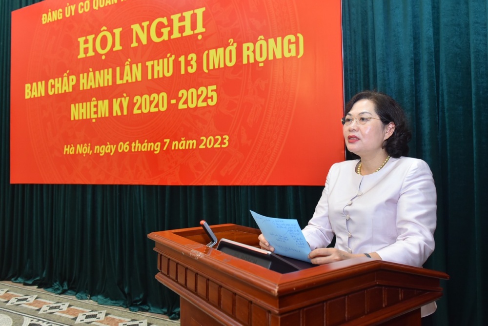 Nhận diện khó khăn trong 6 tháng cuối năm vẫn còn rất lớn đối với công tác điều hành chính sách tiền tệ, Thống đốc Nguyễn Thị Hồng đề nghị các đồng chí ủy viên Ban Chấp hành Đảng bộ, các ban tham mưu của Đảng ủy và các cấp ủy trực thuộc cần thường xuyên bám sát các nghị quyết của Đảng, Quốc hội, chỉ đạo của Chính phủ và diễn biến tình hình thực tiễn, phối hợp chặt chẽ với lãnh đạo chính quyền trong việc lãnh đạo, chỉ đạo cán bộ, đảng viên thực hiện tốt chức trách, nhiệm vụ được giao, phát huy tinh thần tiên phong, gương mẫu của các đảng viên phấn đấu làm tốt nhiệm vụ được giao cả về công tác chính trị và công tác Đảng.