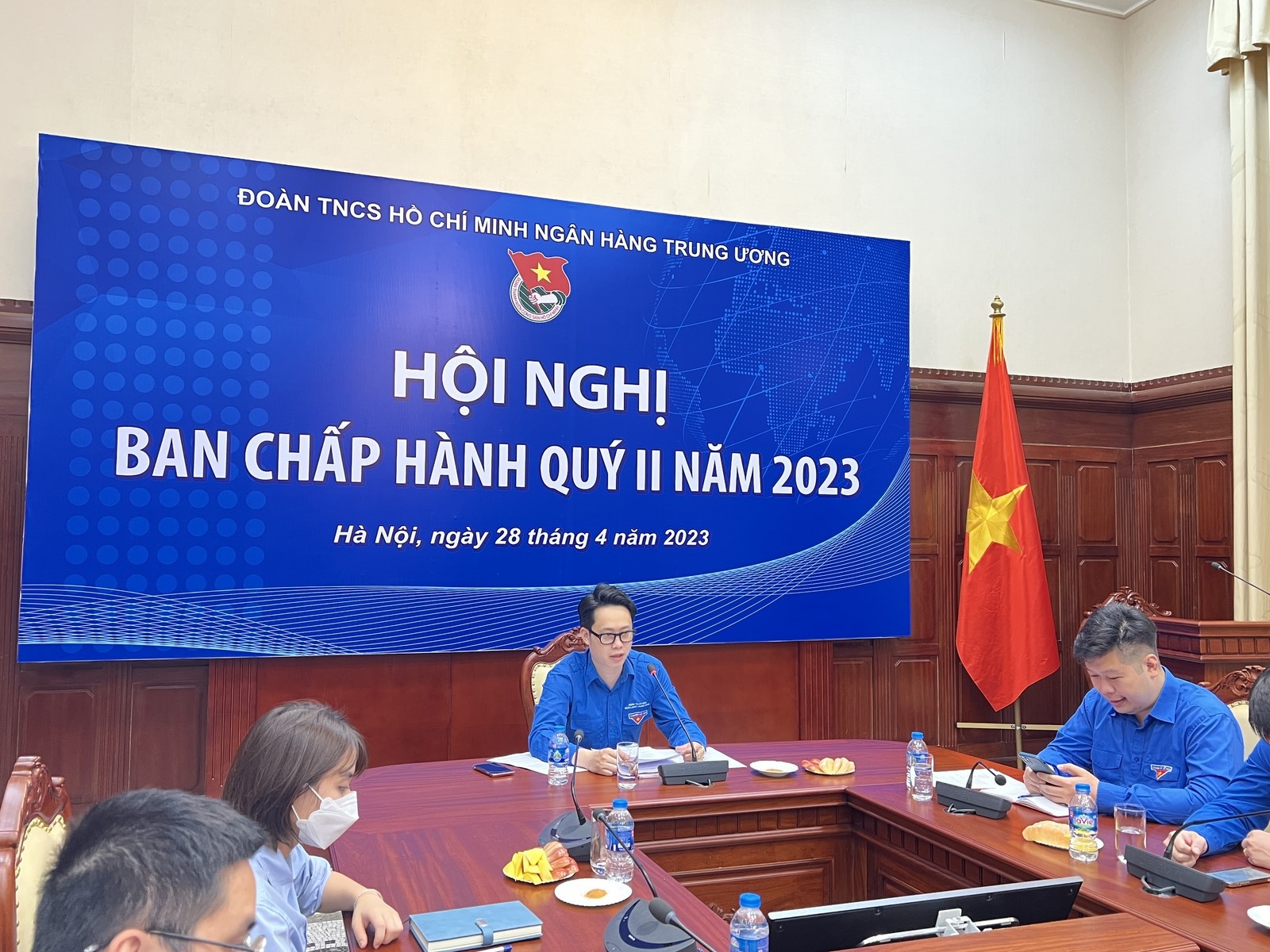 | Đồng chí Trương Anh Hoà – Ủy viên Ban Thường vụ, Chánh Văn phòng Đoàn Thanh niên NHTW (bên trái) báo cáo kết quả công tác đoàn và phong trào thanh niên quý I và định hướng hoạt động quý II/2023 |